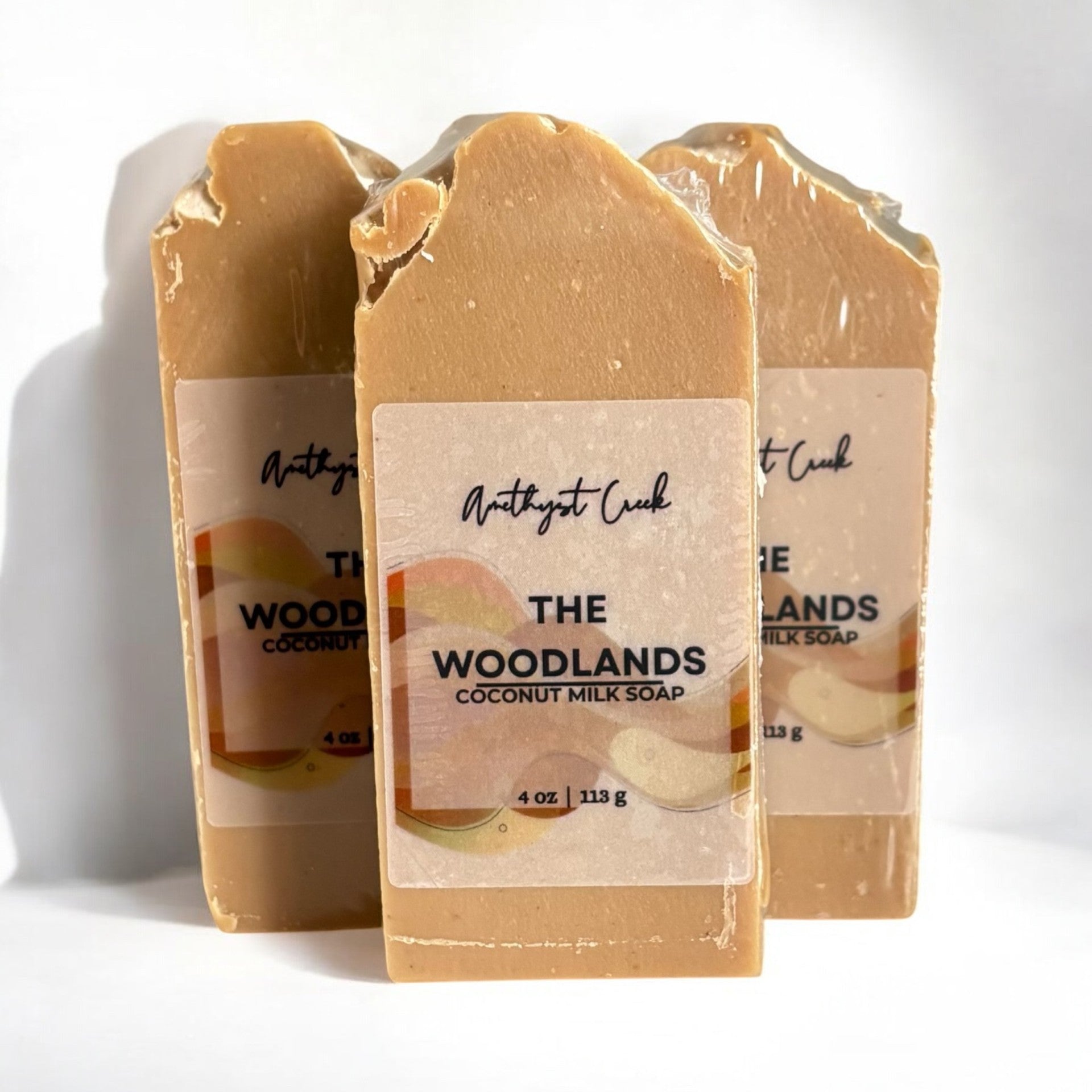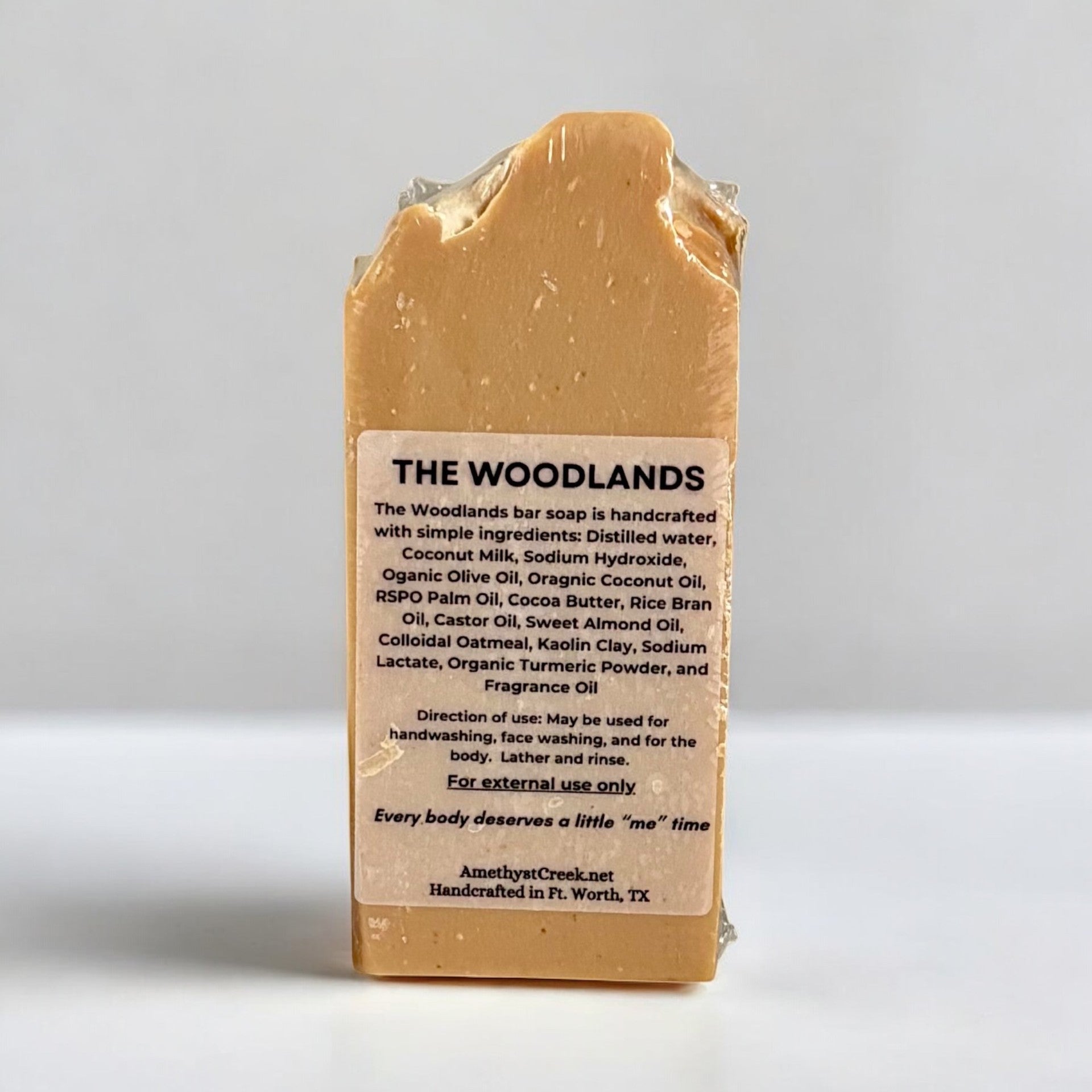 The Woodlands bar soap is handcrafted with simple ingredients: Distilled water, Coconut Milk, Sodium Hydroxide, Olive Oil, Coconut Oil, RSPO Palm Oil, Cocoa Butter, Rice Bran Oil, Castor Oil, Sweet Almond Oil, Colloidal Oatmeal, Kaolin Clay, Sodium Lactate, Organic Turmeric Powder, & Fragrance Oil